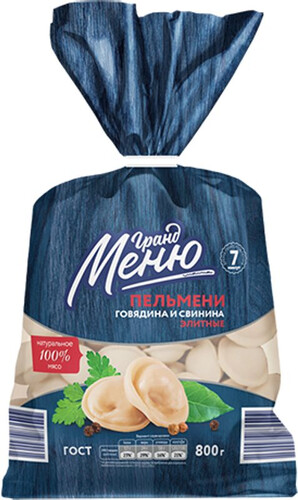 Пельмени ГРАНД МЕНЮ Элитные говядина и свинина 800гИдеальные пельмени из говядины «ГРАНД МЕНЮ». В составе сочный фарш, соль, лук и перец. Тесто в пельменях — эластичное и не развалится при варке.